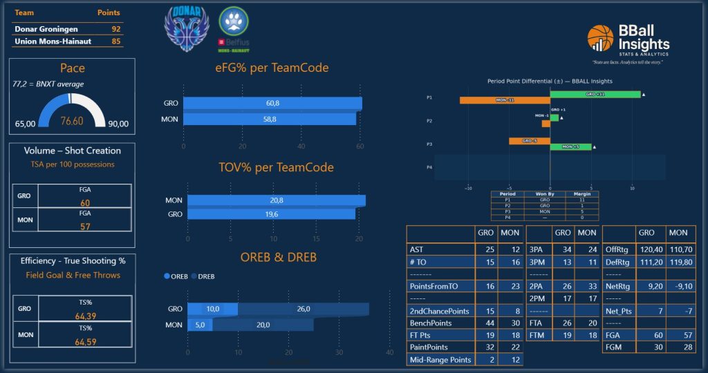Game-defining swing: Turning point (Grootste swing over 2 min window): DHE zette de grootste swing neer (Q2 5:51 → Q2 4:07, Δ+10).